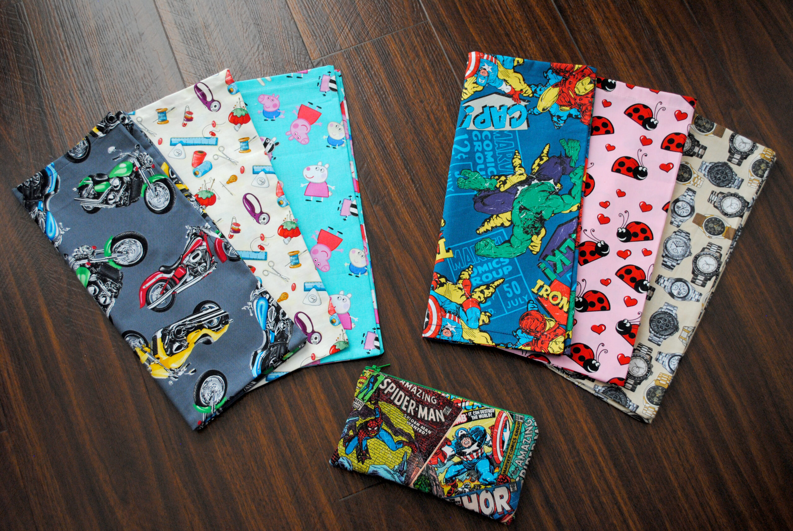 | Material | Doctor Who, Lady Birds, Map of London, Map of the World, Motorbikes, Owls, Peppa Pig, Sewing, Watches |